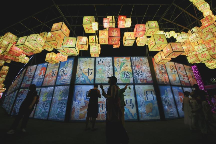 本次燈會刮起濃濃“國潮風(fēng)”。燈會入口是一座中式建筑風(fēng)格的迎賓門,長達(dá)50米的迎賓廊道掛滿燈籠,市民游客穿行其間,恍如置身漢唐;十二生肖彩燈俏皮靈動,精致絢爛;百余句經(jīng)典詩詞點(diǎn)亮道旁樹木;百家姓燈籠組成長龍,中華傳統(tǒng)文化韻味十足。